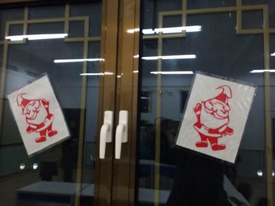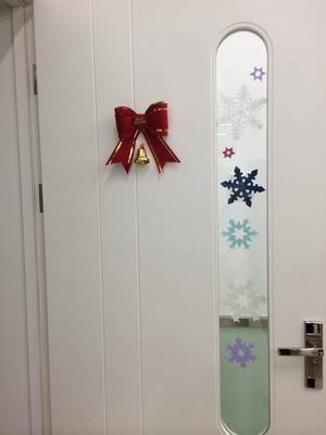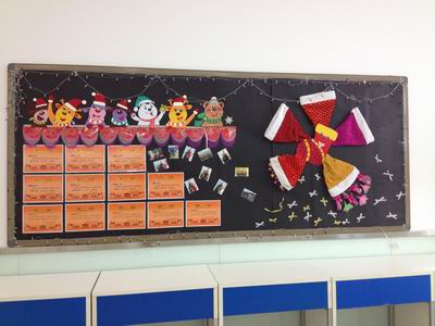小六班漫天七彩的花朵,闪亮的金星和孩子们天真无邪的笑脸挂满了整棵美丽的圣诞树;教室门上的雪花,窗上的窗花,多彩的相框,件件都是老师们亲手制作的。看那栩栩如生的圣诞小红袜和那生动传神的圣诞老爷爷,不得不让人赞叹我们的老师,个个都是能工巧匠啊!