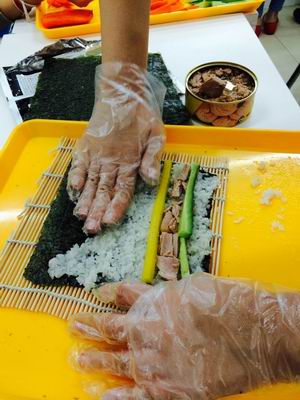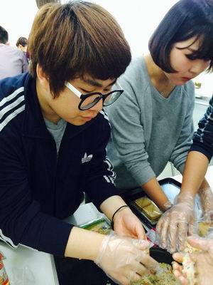 因为有些学生从来没有亲自做过寿司,所以,汉语部的老师特意把会做寿司的朝鲜族老师李雪花请到了活动中。李老师一边认真地做着寿司,一边耐心地传授做寿司的方法和技巧,同学们安静地站在一旁,目不转睛地看着老师的每一次示范,并在心里默默记下了做寿司的每一道工序和要领。老师的演示完成后,同学们跃跃欲试,有的煮饭、有的配料,互相帮助、分工有序,忙得不亦乐乎。最终,在老师们的指导下,同学们不仅成功做出了寿司;还依照个人喜好,通过增减食料创造出了不同口味、色香俱佳的寿司。