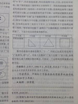 我校国际英语部初三年级韩国学生金韩中,于2013年11月8日在《学科教学》上发表论文《利用图形的“位数”教学法小考》。该论文主要介绍了如何利用不同的图形,来帮助刚刚学习数学的学生更好地理解和记忆数字;如何通过方法来形象标记和准确表达数字和位数。该文从儿童最早接触的个位数字出发,依次用等腰直角三角形、等边三角形、正方形来表示十位数、百位数、千位数。