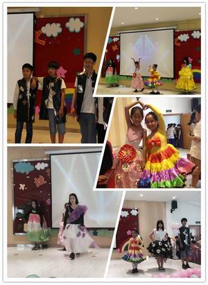 活动最后是孩子们的走秀表演,包括国际部校服秀、公主服装秀、环保服装秀三个环节。美术老师带领师生们用双手变废为宝,自主设计,大胆构思,让废旧物品在双双巧手中变成了丰富多彩的服饰。废弃布料、彩色塑料袋、塑料亮片珠子、黑色垃圾袋和白色纸杯是服装的主要材料。这些随手可得的材料经过精心设计、奇妙构思,把同学们装扮一新,将日常生活淋漓尽致地演绎为高雅的服装艺术。精彩绝伦的走秀表演将整台活动的气氛推向了高潮。