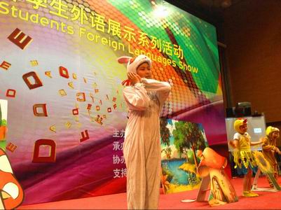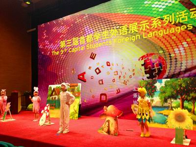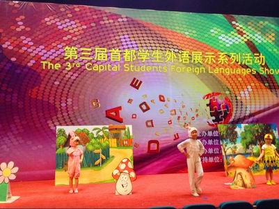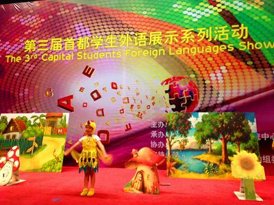 6月6日,第三届首都学生外语展示系列活动小学组预赛在北京芳草地国际小学举行,来自各区县的数百所学校的小学生参加了比赛。《白雪公主》、《七个小矮人》、《卖火柴的小女孩》……一个个耳熟能详的童话故事被小学生们精心改编成英语短剧搬上舞台,活灵活现的卡通形象、流利的口语、童真的表演,让人忍俊不禁,大为赞赏。我校国际部精心编排的英语短剧《龟兔赛跑》也参加了此次比赛。小选手们流利标准的英语口语、新颖别致的服装道具、富有感染力的舞台表现以及独特的创造力,博得了现场观众的阵阵喝彩,给评委们留下了深刻的印象。而我校也顺利晋级,入围到总决赛中。
