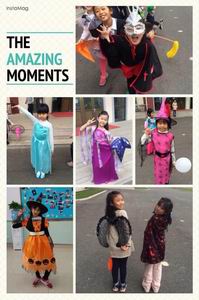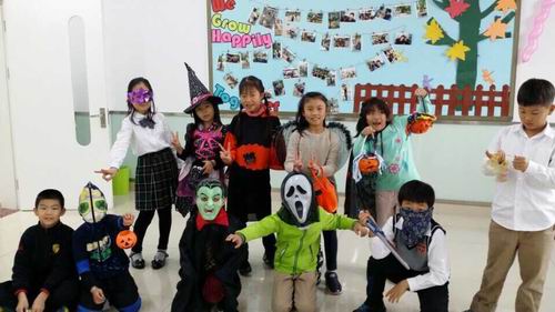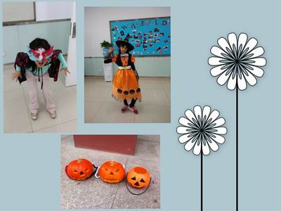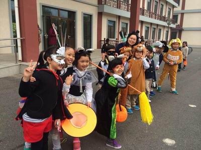 各个班级都被南瓜、彩条和五彩斑斓的气球点缀着,有的孩子们手里还拿着自制的颜色各异的灯笼和南瓜造型,生动有趣、别具特色。当孩子们换好自己的装扮以后,更让人大开眼界:有背着乌龟壳的可爱小乌龟,有披着黑色披风的蜘蛛侠,有帅气的小王子,有带着灵巧的魔术棒的花仙子,有漂亮的白雪公主,有提着 “杰克灯”的幽灵,还有黑蝙蝠、小花豹、大灰狼……好不热闹!装扮好后,孩子们结伴到各个楼层,敲开老师们的办公室,一张张小嘴巴念念有词:“Trick or treat!Trick or treat!”在带给了老师们一份欢乐之余,小鬼们也从老师那里收获了甜甜的糖果和由衷的开心。