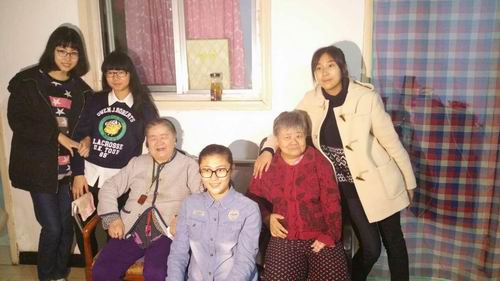 高语阳、法维珊小组,由5个人组成。她们去的是北京著名的仁爱敬老院,由于是第一次走进这样的地方,大家难免有一些紧张和不知所措。随着跟老人的接触和了解,她们也慢慢消除了紧张情绪,开始陪老人们聊天,给他们表演节目。那个时候她们似乎都忘记了彼此的身份,用最简单而又最温暖的方式传递爱和问候。