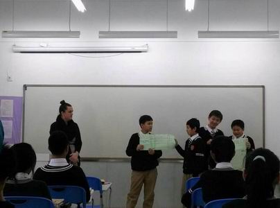 首先是英数课,英数老师Allison满带笑容走进教室;在跟家长们做了简单的自我介绍后很快就进入了课堂。同学们按照Allison老师的要求,以小组的形式把学过的数学知识用过山车等有趣、具体的图表展示了出来,并用纯正的英文专业术语对图表进行了解释说明,这使得枯燥难懂的数学公式变得浅显易懂且趣味横生。