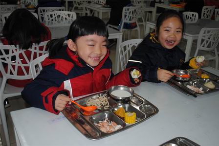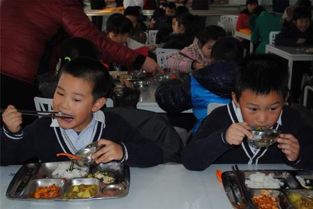 我校领导、教师及相关工作人员高度重视学生们的身体成长与健康,餐厅有专门的营养师为孩子们搭配营养餐,并定期更换菜谱;孩子们对美餐喜爱有加,胃口大开。