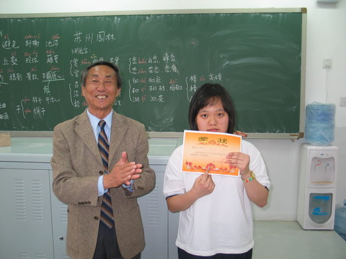 我校韩国留学生“高秀儿”在2006年“HSK”考试中获得了“高级九级”的好成绩!学校领导于校长给她颁发了奖状和奖金,以示鼓励!