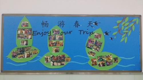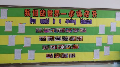 春天是一年中最美的季节,是学生外出踏青的好时候,在前阶段的社会实践活动中,孩子们亲近了自然,放飞了心情,还有效培养和加强了学生的团队精神和小组合作能力。老师们用相机、手机记录下了孩子们欢乐的、有纪念意义的瞬间。而本月的国际部小学各班以“社会实践活动缩影”为主题布置班级。各班主任十分重视,以积极的态度抓好这项工作,因而教室布置得井井有条、别出心裁,令人赏心悦目。各个班级都贴上孩子们在社会实践活动中的靓照,有的班级展出了学生亲手剪刻的纸工作品;有的写上美好的祝语或自己的理想;有的班级将学生的美术作品或优秀学习作品张贴出来。各班的桌椅、书柜更是整齐有序;班容班貌整体水平较高,班班精彩。