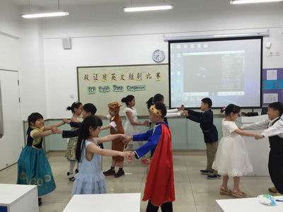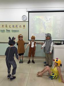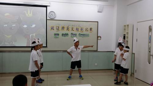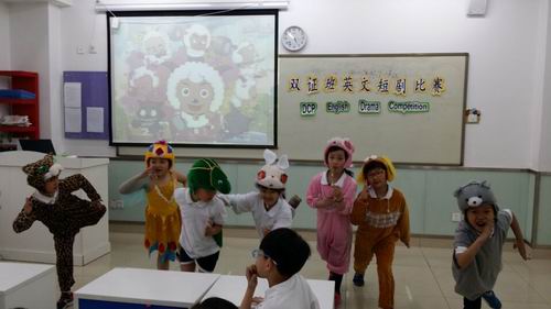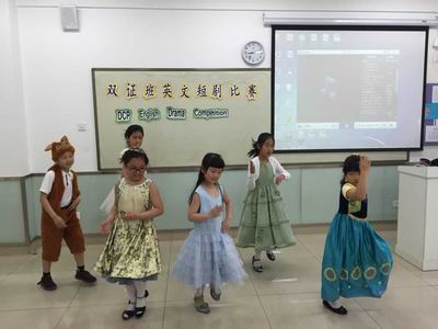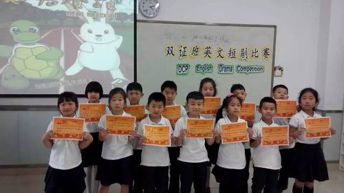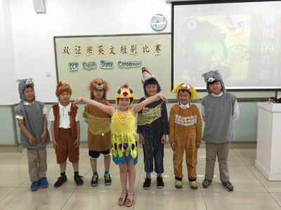 傲慢的孔雀、聪明的狐狸、凶狠的大灰狼、可爱的小兔子、机灵的小猴子……双证三年级的短剧《骄傲的孔雀》以生动的画面、丰富的想象、流畅的英语给现场的老师和同学们留下了深刻的印象;人人喜爱的经典剧目《灰姑娘》更是以栩栩如生的演绎、标准悦耳的发音,牵引着观众们的情思。二年级的短剧《喜羊羊与灰太狼》让孩子们体验到了做小老师的乐趣,有模有样的演出体现了孩子们自己的快乐,而小小年纪就展现出来的流利的口语表达能力又让我们佩服。更让人叫绝的是短剧《龟兔赛跑》,夸张的表演、幽默的语言,引得在场观众捧腹大笑,掌声不断……在欢快的歌舞中,此次双证班的短剧表演比赛顺利结束。老师们对每个孩子的表现都进行了评分,选出了“最佳男主角”、“最佳女主角”、“最佳合作奖”、“最佳表现奖”等多个奖项。