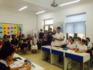 不到八点,初中双证班的家长们就陆续走进教学区。干净明亮的教室,现代化的教学环境,各有千秋的班级文化,这一切都给他们留下了深刻的印象。八点整,展示活动开始了。此次展示分为中、英文两个环节,以学生为主导。英文部分,同学们分别从数学、科学和传统文化三个大方面展示了自己所学的知识。首先是英数老师Allison设计的quiz show环节,赵轩民同学像专业主持人一般幽默风趣地介绍了参赛双方并开启了整个quiz show;大家全神贯注,争取答好每一道题。接下来的科学课中,同学们用事先做好的树和花朵的模型生动形象地介绍了植物的生命周期和动物的特点与生活习惯。最后,孙泽林、张子璐、赵轩民等同学用PPT展示加演讲的方式分别从中西文化和科学的角度探讨了地球上生命的起源。同学们落落大方的姿态、地道流利的英语都得到了家长和老师们赞许的目光。值得一提的是,在讲述过程中,同学们还像小老师一样积极与听众互动,深入浅出、诙谐幽默的语言让听众感到轻松愉悦。