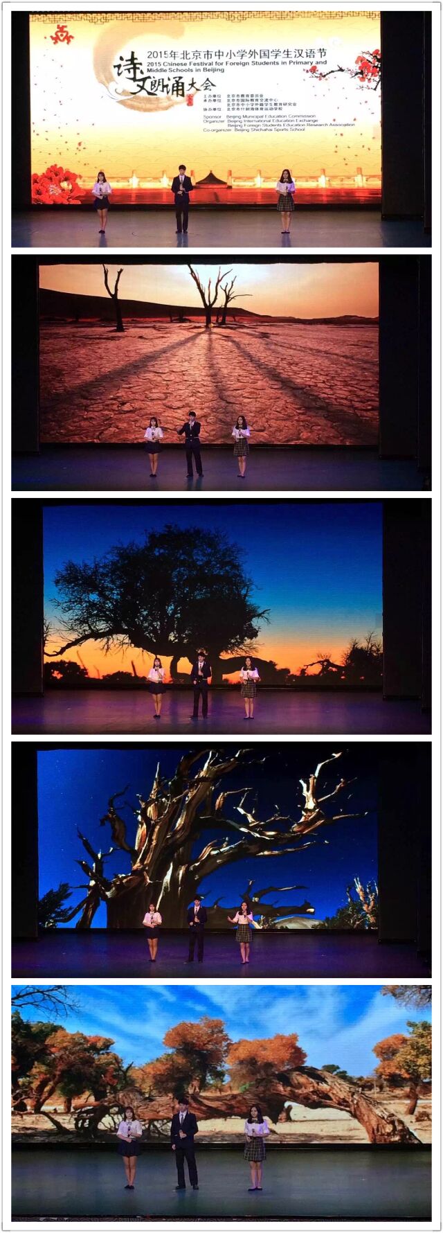 为了进一步激发外国中、小学生学习汉语的兴趣,加深他们对中国文化的了解,丰富他们的课余生活,北京市国际教育交流中心于2015年11月11日在北京什刹海体育运动学校剧场举办了“2015年北京市中小学外国学生汉语节诗文朗诵大会”活动。我校国际部的学生们在老师的带领下参加了此次活动。虽然活动当天天气寒冷,但是老师和同学们热情高涨,以最佳的精神状态参加了此次大赛。