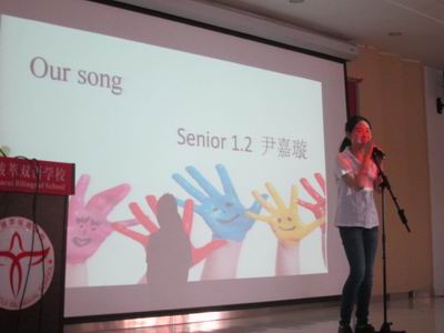 13点45分,主持人激情的“Let’s cheer up and sing”宣告正式拉开了比赛的序幕。选手们深情献唱,个个声情并茂。轻快舒缓的“Night changes”,四个男孩为我们深情展现,不管世事怎样变迁,始终有我在你身边。一首英式摇滚“Glad you came”为我们带来了仿如清爽夏日的轻松感觉,也表达了学生们对他们喜爱的老师的热烈欢迎。SACE班的韩国学生鞠涛娟带来的“Rolling in the deep”,独特的音调,来自灵魂深处的呐喊,将整个比赛推向了高潮。随后三个男孩和一个女孩共同演唱了一首加拿大流行歌曲“Boy friend”,他们用轻快的旋律,活泼的舞台表演,淋漓尽致的展现出了国际部学生的独特魅力。“Our song”,用歌曲唱出了日常生活的点点滴滴,尹嘉璇同学将这首歌展现的唯美抒情,将整个英语歌曲大赛推向了另一个高潮……