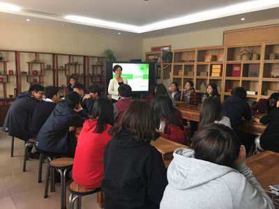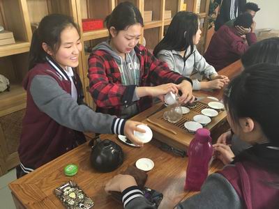 一进教室,学生们就被古色古香的茶具、茶叶、茶壶摆设所深深吸引,不禁问起了老师各种各样的问题。授课的老师别出心裁,让同学们带着问题开始了今天的课程。老师首先介绍到茶的故乡是中国;做为茶的发源地,中国也是最大的产茶大国之一。为了让学生们初步地了解茶,老师又准备了一碟碟不同的茶叶来供学生们观察、嗅、品,同学们依次传递着手中的茶并互相讨论着。有了感观的初步了解之后,老师开始介绍今天的主角---六大茶类,分别是绿茶、红茶、白茶、黑茶、黄茶、青茶。绿茶,顾名思义颜色是绿色的,茶农们经过采青---炒制---揉捻---干燥等精细的制茶过程制作出一片片绿茶,同学们细心的观察着、努力的学着。再接下来看的是红茶,虽然茶的颜色是黑色,但泡入水中之后便呈现红色,因此得名……六大茶类逐一观察完后,老师开始教同学们如何握杯,如何叠茶巾,如何进行泡茶前的准备工作。同学们认真的学着,并在一番练习后进行了一场叠茶巾的小比赛。表现积极突出的同学还得到了老师准备的小礼品。准备工作做好之后,就是最重要、最有趣的泡茶环节了。老师首先给同学们做出了优雅的示范:摆好茶具和茶巾,准备好滤网放在茶壶上,将茶叶夹取少许放入盖碗中,将开水倒入盖碗并对准滤网缓缓地倒入茶壶中,用手拿起茶壶、借助手腕的力量绕动茶壶使其冲泡完全,然后再斟满每一个茶杯……同学们看得目不转睛,并且跃跃欲试,学习、操作如何泡茶。刚开始的时候同学们的动作还不太熟练,有些笨手笨脚;但坚持着一点点的尝试、一点点的摸索、一点点的战胜自己,同学们最终获得了成功!到最后,每位同学都为老师和自己的伙伴泡出了一壶清香的热茶,边饮边讨论,极有成就感。