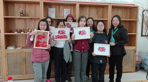 同学们分成两组,分别参加了剪纸与木工课程,每项课程大概两小时。走进剪纸教室,桌子上早已摆放好了剪刀、胶水、红纸以及装裱画框等。老师先为大家讲解了中国民间剪纸的历史发展,展示了传统花纹图样和常见的一些图案,以及剪纸图案中蕴含的民俗特征和文化含义。接下来,老师为大家现场演示了怎样剪“囍”字。按照老师传授的口诀,同学们很快就成功剪出了第一个作品。随后,老师又拿出一个“金鸡报晓”的图样,继续教给大家一些用剪刀的技巧,并给每位同学都做了单独的指导。大家一边动手,一边体会;不一会儿,一只只形象鲜明的大公鸡就跃然纸上了。最后,老师帮助大家亲手装裱了自己的作品,为大家的体验活动做了总结,还和大家合影留念。