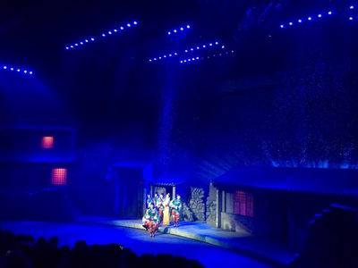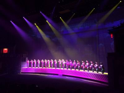 接着,大家乘车赶往第二个目的地——位于河北省蔚县的暖泉古镇。这里有着历时500多年的传统民俗文化活动、河北省省级非物质文化遗产——打树花。打树花,指的是身穿羊皮袄、头戴斗笠的艺人们,用特制的木勺将高温下融化的铁水用力泼洒在坚硬的城墙上;1000多度的铁水打在冰冷的墙上,迸溅出朵朵璀璨的火花,串起来呈树冠状,犹如枝繁叶茂、万花绽放的树冠。连著名的唐代诗人李白,都曾在《秋浦歌十七首》中盛赞了这项民间艺术活动:“炉火照天地,红星乱紫烟。赧郎明月夜,歌曲动寒川。”同学们出发之前就对传说中的奇绝打树花表演有所耳闻,一路上充满了期待,完全忘记了旅途的疲惫。晚上7点,同学们准时来到剧场,观看演出。一走进表演大厅,同学们就被极具地方特色的舞台布置所吸引了;而在亲眼观看了打树花表演后,同学们更是惊叹不已、赞颂不已、激动不已。每个人都拼命地按下快门,拍照留念;并在表演结束后,报以极其热烈的掌声和叫好声。不少同学纷纷表示,回家后一定要给家人们看一看照片,讲解一下这精彩的表演,与家人分享观看演出后的深刻感触。