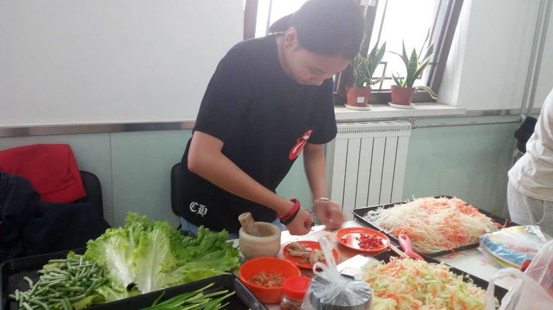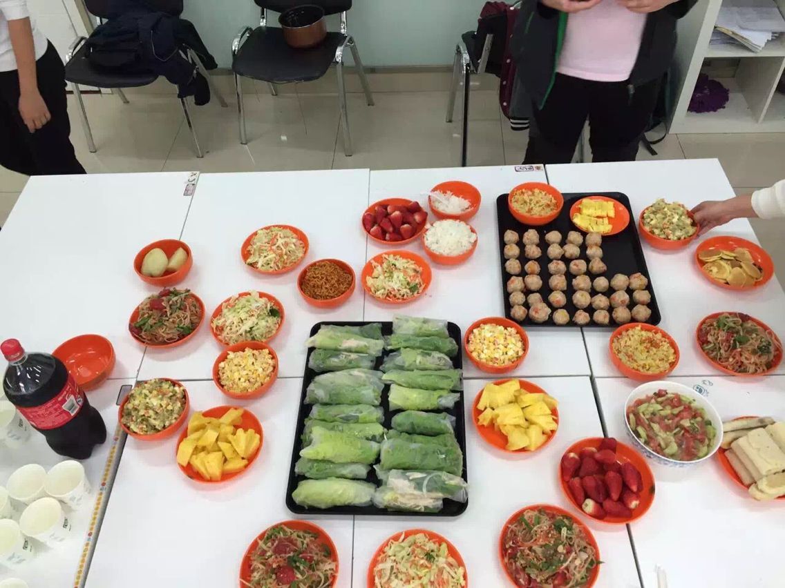近日,在汉语部高三教室长长的桌子上摆满越南春卷,青木瓜拌菜,鸡丝凉菜,香煎蛋黄饼,牛肉沙拉,韩国饭团,炒饭... ...这不是普通的聚会,而是高三班毕业班组织的“庆祝结业美食分享会”。