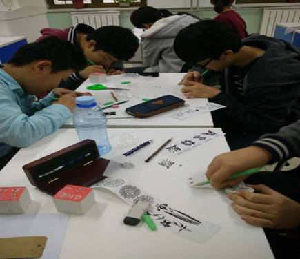 在英语部初中的中国文化课上,老师教授留学生们怎样制作橡皮印章,并用篆体在印章上刻出自己的中文名字。同学们对这种新的汉字体式非常感兴趣,他们用自己的小纂刀在小橡皮砖上认认真真的雕刻起来,还不时互相交流雕刻的方法,探讨的不亦乐乎。