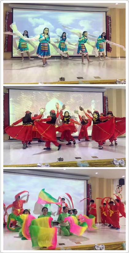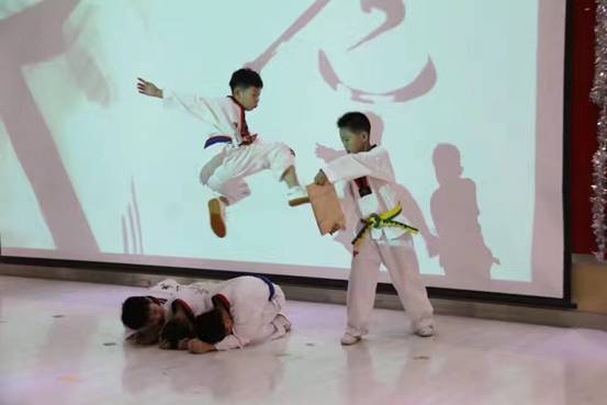 班级的活动结束后,全体小学生在六月二日上午为家长们献上了一台由15个节目组成的精彩绝伦的汇报演出。这台演出形式多样、耐人寻味,除一些传统歌舞类表演外,女子体操、花式篮球、传统跆拳道等体育项目也登上了舞台,孩子们将它们与文艺相结合排练出的新节目为整场演出增加了看点和色彩。每一个站在闪光灯下的孩子都如小艺术家一般镇定从容,他们优雅的台风、熟练的演技、灿烂的笑容博得了台下家长和老师们的阵阵赞叹和雷鸣般的掌声。