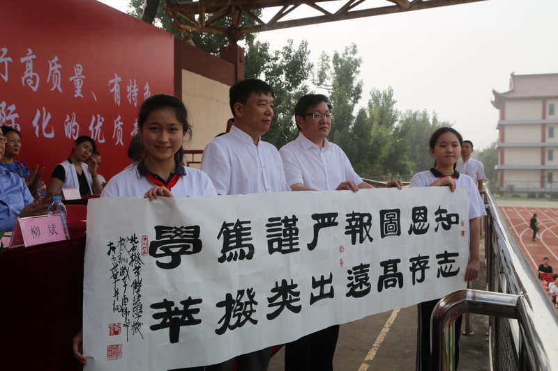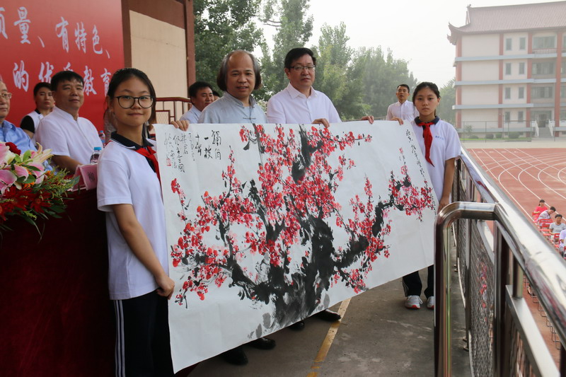 来校参加开学典礼的中央党校中国领导科学杂志社美术总编、清华大学中国产业经济发展研究中心艺术委员会主席谢飞和全国人大画院院长李林君分别向拔萃学校赠送了书画作品,激励学生立志上进。