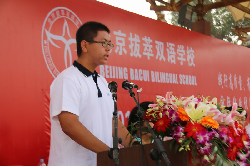 高一1班红萃生齐羽飞同学代表全校同学表明了努力学习和践行《中小学生守则》、《北京市中小学生日常行为规范》的决心,表示要牢固树立社会主义核心价值观,并使之内化为自觉行动。他号召全校同学牢记“知恩图报,严谨笃学,志存高远,出类拔萃”的校训,做一个理想崇高、遵纪爱校、顽强拼搏、积极进取的拔萃人。