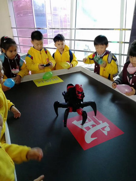 接着,大家来到了机器人竞技场地,一个个机器人仿佛在说“虽然我很小,但我很擅长奔跑、搏击哦!”孩子们一个个摩拳擦掌、跃跃欲试,他们兵分两队开始对战,“吴国加油!”“蜀国加油!”加油声、呐喊声此起彼伏, 这项体验活动既培养了学生的逻辑思维,又增强了团队协作的能力。当看到“乐高拼装教具机器人”时,孩子们直喊“我知道这是什么,是乐高!”但此乐高非彼乐高啊,它是用积木、传感器拼装成的一个电风扇,不仅可以变成小汽车,还可以成为扫地机器人,孩子们都不由得感叹:自己太落后了,很多都没有听说过呢!并下决心要努力学好知识,将来发明新型机器人!