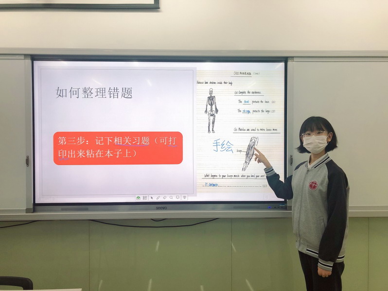 接着,裴墨妍同学结合自己的学习经验进行了毫无保留的分享,着重强调了做好笔记与错题整理这两个好方法:第一,做笔记是对上课听讲的一种补充,课后翻看笔记时,能够及时发现自己不会或是掌握不好的知识点,进行不断巩固复习,达到事半功倍之效果。第二点是关于整理错题,学姐给出的方法是:建议大家在考试前一个月的时候再整理错题,因为同学们会做很多套试卷,有些容易犯错的知识点一定需要再次归类并总结,记录在错题本上就给自己起到了一个提醒和强调的作用。