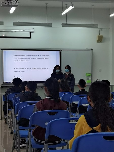 校长激情四射的与学生们互动,让学生们明白每个人都应有学习和奋斗的目标,并为之努力奋斗、最终实现和达成。对于我们六年级毕业班,CAIE的考试就是当下学习目标和任务,想要达到这个目标就需要遵循 “Maximize our abilities”(最大化我们的能力),以及“to build a solid foundation”(建造夯实基础)。学生们不仅明白了毕业班学生的学习任务,而且在跟校长的交流学习中丰富了英语词汇,巩固了英语语法,拓宽了眼界和思维。
