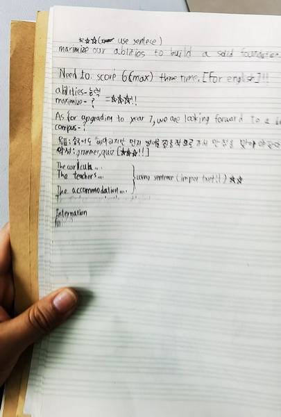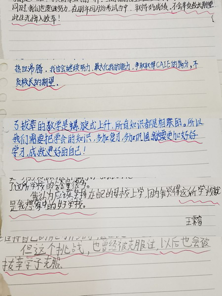 “课后”孩子们在笔记本上写下自己的感受:我会继续努力,最大化我的能力,不辜负校长的期望;我们了解了学校的教学是螺旋式上升的,所有的知识都是相关联的,我要更加好好学习,成就更好的自己;不会辜负校长与老师对他们的期望,拔萃是自己的母校,此生无悔入拔萃,来年还愿继续做拔萃学子!