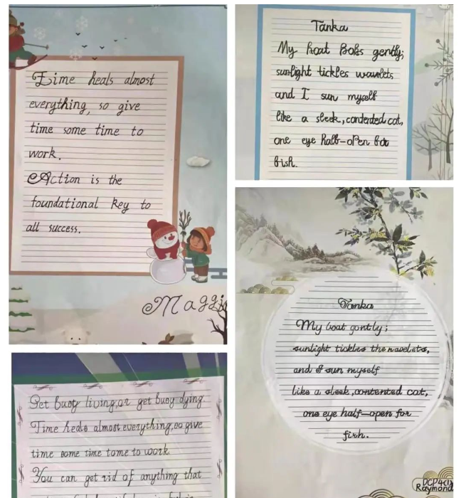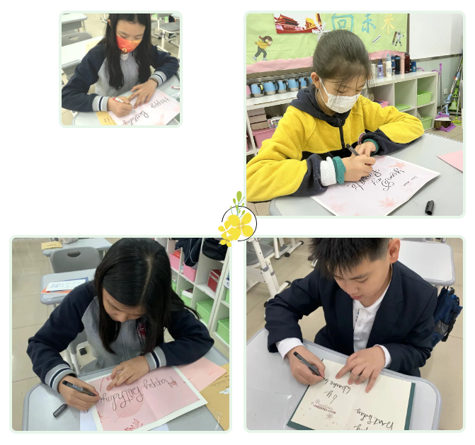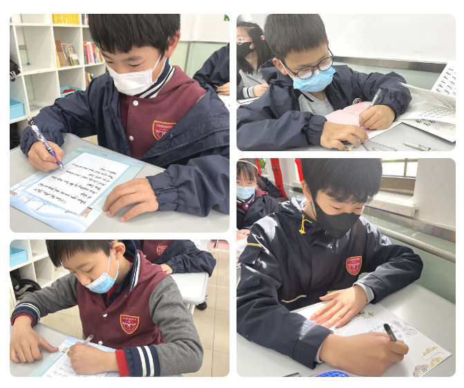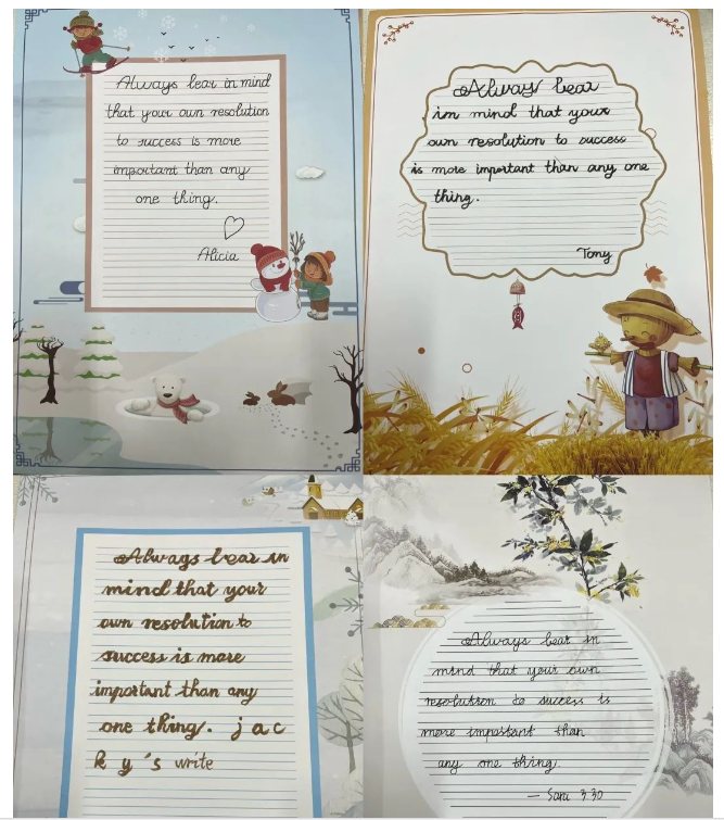 同学们都沉浸在书写的世界中,或低头凝神,或聚思笔尖,行云流水的花体字在不同学生的笔下各有特色。看着纸张上多出来的一行行工整字体,他们的内心也充满了成就感。
