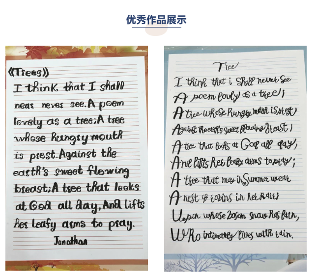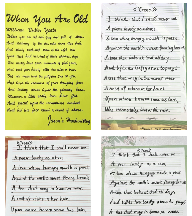 花体字起源于拉丁文,在艺术史上有着自己的独特魅力,用花体字记录下美好的诗句,我们更能感受到书法艺术的美妙。拔萃双语部4-6年级的莘莘学子们参加了这象征着传承和美好的英语花体字比赛,在比赛中他们加深了对花体字的理解和感悟,规范了英语书写,并且乐在其中。