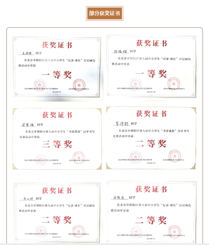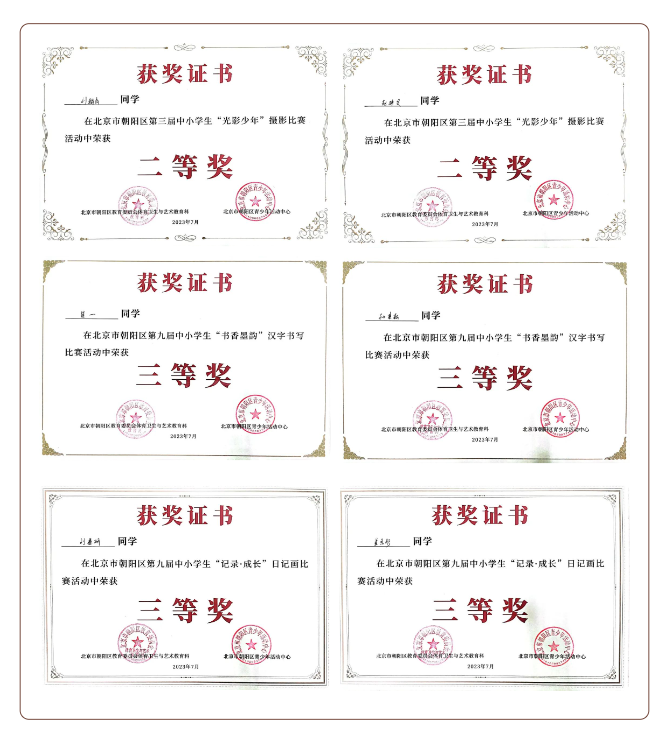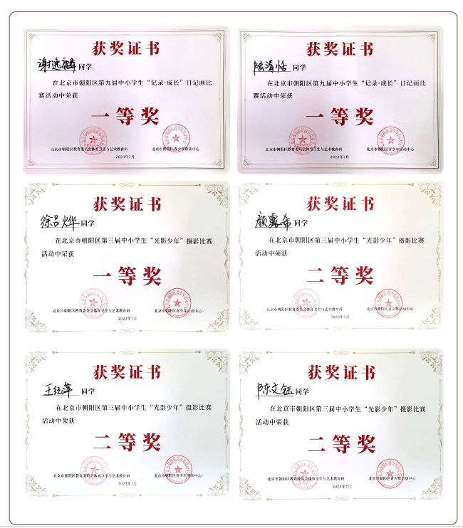 为推进学校美育工作的发展,提高学生的艺术修养和审美情趣,今年5月-10月,我校组织学生参加了由朝阳区教育委员会体育卫生与艺术教育科、朝阳区青少年活动中心主办的北京市朝阳区第九届“记录·成长”日记画比赛、北京市朝阳区第九届“书香墨韵”汉字书写比赛、北京市朝阳区第三届“光影少年”摄影比赛。学校通过校级评选,推选出优秀作品参加区级评比,最终共有五十余人次,分获一、二、三等奖。