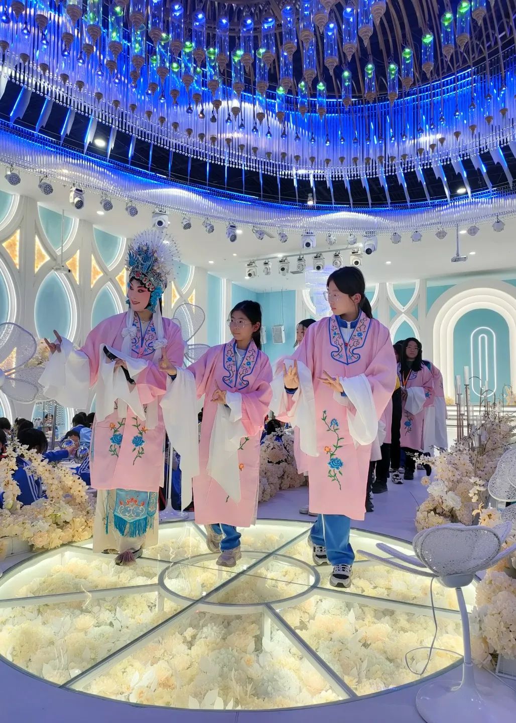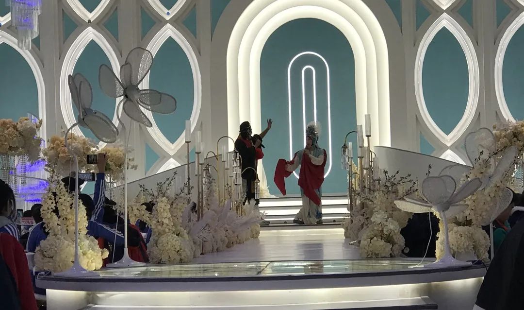 非遗戏曲传承人向同学们介绍了“耍孩儿”剧种特色、代表作等,并表演了经典曲目。同学们穿着青衣跟随传承人学习基础步伐、甩袖、眼神等动作,不仅让师生们在潜移默化中亲身感受到戏曲艺术的无穷魅力,体会到中华民族传统文化的博大精深,也增强了同学们的民族自豪感和认同感。