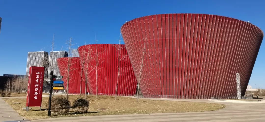 在国宝中汲取力量,在历史中寻找方向。太原博物馆建筑外形独特,灵感来源于中国红灯笼,主要建筑为5个相对独立又相互连通的椭圆倒锥体块连接组合而成,以中国红和青铜色为建筑外墙主色调。