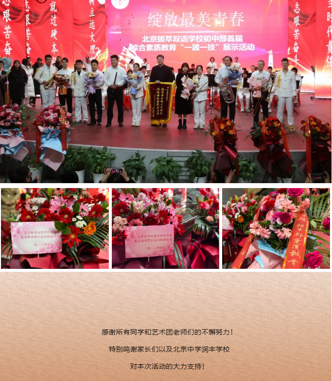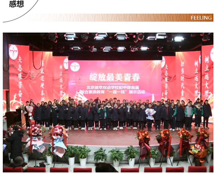 为展现学生阶段性的学习成果,让每个学生都能在擅长的舞台收获属于自己的掌声。2023年12月21日下午,拔萃学校初中部初一、初二全体师生和家长欢聚在北京中学润丰学校大礼堂,参加了绽放最美青春——综合素质教育“一器一技”展示活动。