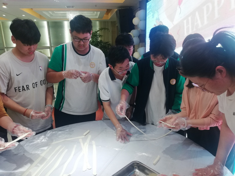 我们还在面点师傅指导下,学做biangbiang面。师生们分批取面剂子,用手按扁,再用擀面杖轻轻擀成宽面,大拇指捏住面剂两头,在案板上均匀用力摔打,同时往两边扯长……这次体验给大家留下深刻的印象,返校许久,很多人还念念不忘面的清香。