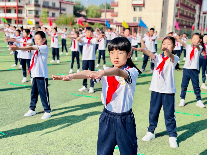 接着,三套特色广播操展演掀开华章:同学们屈肘推掌演绎《国学手位操》,衣袖翻飞间似有汉唐风骨流转;《希望风帆》体操更显磅礴气象,手臂如林举落如潮,转身踢腿时卷起的气流,让主席台横幅猎猎作响;压轴的《向前冲》绳操甩出青春弧线,彩色跳绳破空声如春雷阵阵。