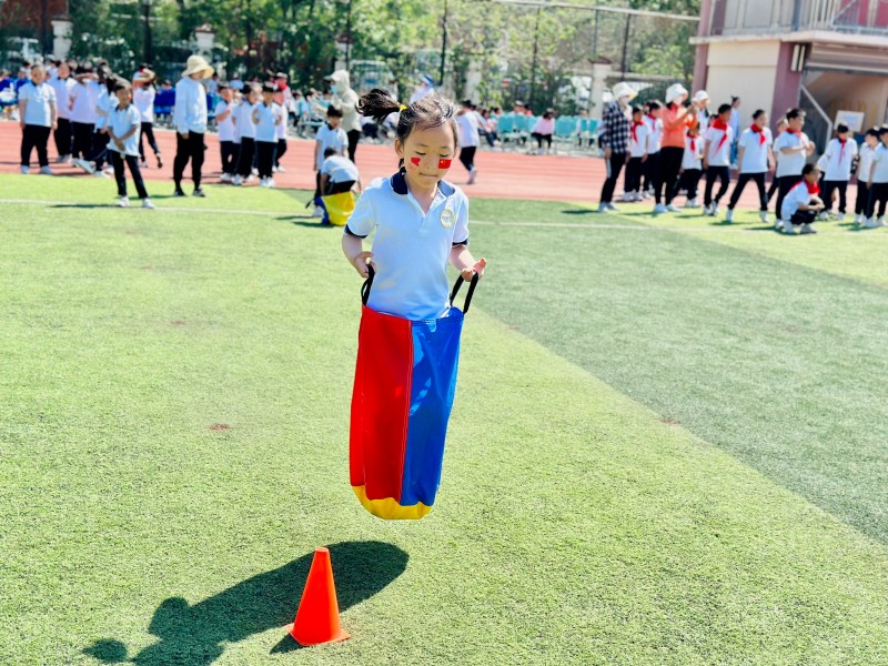 操场翻涌成七彩琉璃海,十一座个人闯关游戏项目翻卷着快乐的波浪。这边,孩子们踮脚轻抛羽毛球。每当有运动员将球投进卡通动物的大嘴巴里时,围观的羊角辫们便掀起欢呼的浪花。那边,蓝潮铁环阵滚着海的呢喃,湛蓝圆环在跑道来回穿梭,似浪花追逐退涨的潮汐。仰卧起坐营跃动着协作的节拍,压腿的"小锚"紧抓伙伴脚踝,仰卧的"小弓"绷成弦月。每完成一次起伏,游戏卡就多一枚通关印章。