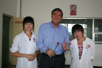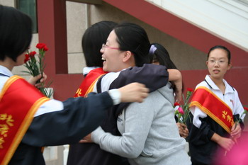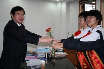 6点40,老师们陆续向餐厅走来,学生干部立刻迎上前去,献上康乃馨及我们对教师最真挚的祝福:祝您节日快乐!与此同时,班车也准时到校,学生干部们齐声问候:祝老师节日快乐!您辛苦了!