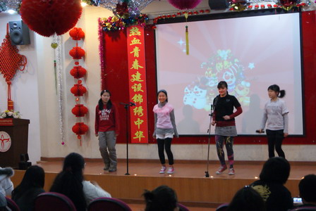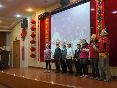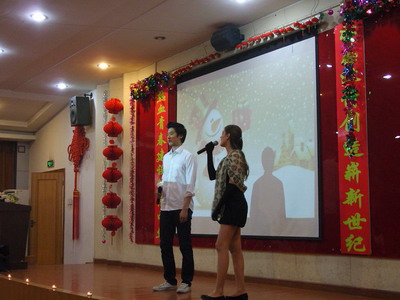 基础班和HSK班联袂演唱一首中国歌曲《甜蜜蜜》,甜美的嗓音略带异域风情,博得了热烈的掌声。英文部的小学生用流利的英语表演课本剧,惟妙惟肖,充满童趣,让现场观众掌声与笑声不断。乌克兰籍学生莎莎和韩国籍学生朴宰莹合唱的《I wanted to》更是吸引了观众的视线。莎莎金发碧眼、身材窈窕,落落大方,俨然一颗耀眼的明星。高大英俊的朴宰莹,略显腼腆,他们的合唱让现场观众一阵吹呼,将联欢会的热烈气氛推向了高潮。