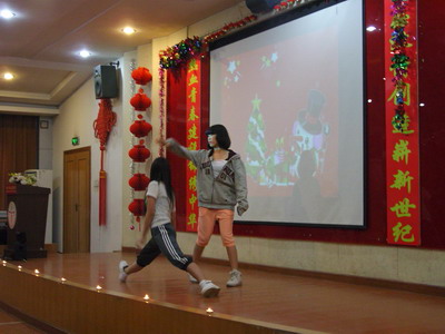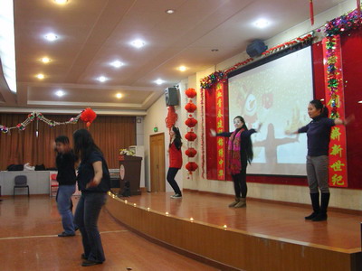 联欢会上,中外教师集体亮相, 表演了自编自导的健美舞。轻快的舞步和着动感的节拍,洋溢着蓬勃向上的朝气,为联欢会增添了更多的乐趣,也给联欢会画上了一个圆满的句号。