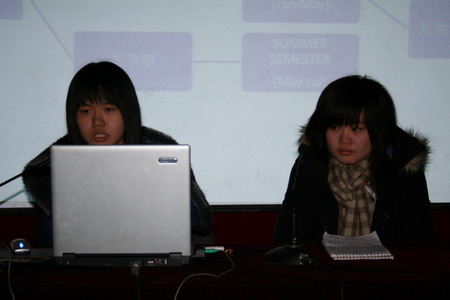 学生王兰、朱惠敏和刘文景根据他们在加拿大半年的学习生活经历和同学们交流了他们的感受:“在国外的学习并不是大家想像的那么轻松,需要大家有很强的自控能力和时间管理能力,老师的教学方法很不一样,学的知识比较有实用价值……”,并给中加班学生的学习提出了中肯的建议:“拔萃的两年对出国前的铺垫很重要,在出国前一定打好英语基础,同时做好其他学科知识的储备。”