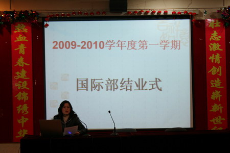 1月16日上午,学校报告厅洋溢着喜庆气氛,国际部教师及全体留学生喜聚一堂, 2009-2010学年度第一学期结业式在这里隆重举行。万小平校长、蒋红霞副校长、张锡华副校长及部分留学生家长出席了结业式。