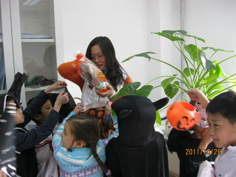 Trick or treat, smell my feet, give me something good to eat.孩子们唱着万圣节的歌谣,打扮成魔鬼,巫婆,公主的样子笑着跳着敲开老师们办公室的门,伸出一双双小手,迫切的想得到糖果,而老师们也是早有准备,拿出一大堆糖果和小礼物分发给孩子们,看着他们拿到宝贝兴奋的样子,老师们也忍不住和他们边唱边跳。