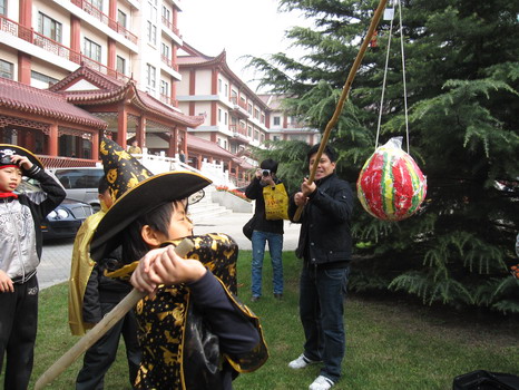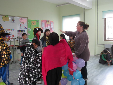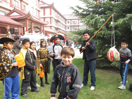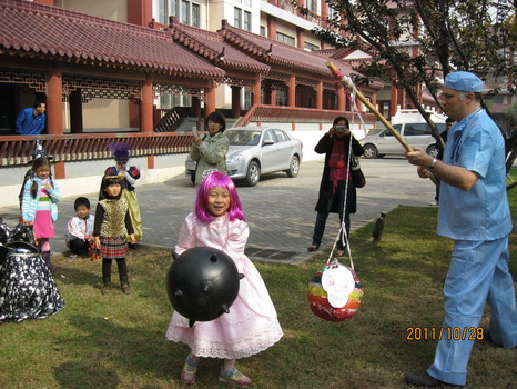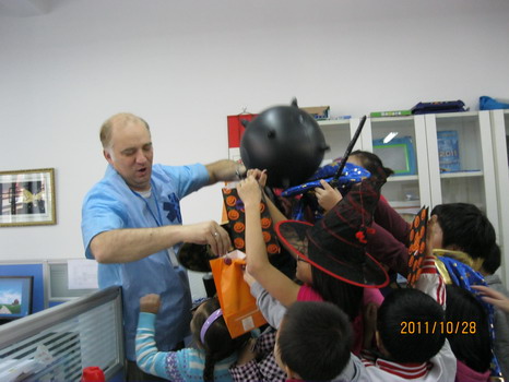 活动的高潮莫过于孩子们最爱的游戏项目了。在外教Katie老师的带领下,孩子们玩起了face painting 的游戏,一张张可爱的小脸马上变成了大花猫,喜洋洋,还有灰太狼,惹得大家一阵阵尖叫。Emma外教准备好了Balloon Tag ,每个孩子的腿上栓好一只气球,在欢快的乐曲中孩子们互相踩破对方的气球,最后剩有气球的同学获胜,所有的同学都积极地参加,现场气氛非常热烈。最让孩子们欣喜的莫过于Andy外教精心准备的Pinatas游戏了,他高高的举起拴在棍子上的彩球,彩球里是包装好的精美糖果,每位小朋友都可以用力的去敲打彩球,直到最后打破彩球取出礼物,孩子们都使出浑身力气,玩得不亦乐乎。活动结束后,孩子们都觉得意犹未尽,盼望着下一个万圣节的到来。