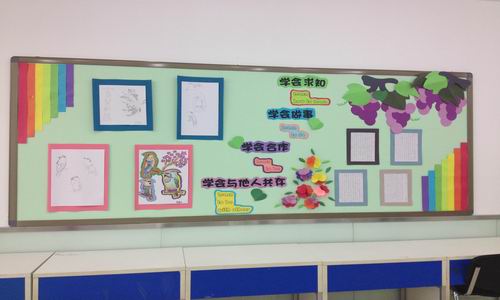 小六班的板报色彩斑斓。七色的彩虹,缤纷的花朵,诱人的葡萄,将孩子们的绘画作品映衬得更加栩栩如生。