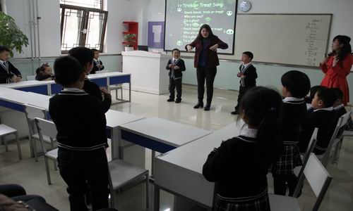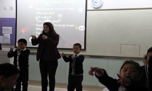 开放日当天恰逢万圣节的第二天,因此,ESOL外教Erica老师围绕着刚结刚欢度完的万圣节进行了展示。Erica老师用一张张可爱的卡通图画引导同学们学习了相关的词汇,然后带领孩子们一边做动作一边唱万圣节歌曲Treat or Trick; 最后又以角色扮演的方式,让同学们分组合作、使用学习过的词汇进行会话表演。同学们争先恐后地积极参与,忙得不亦乐乎,寓学于乐,享受到知识带来的无限乐趣。